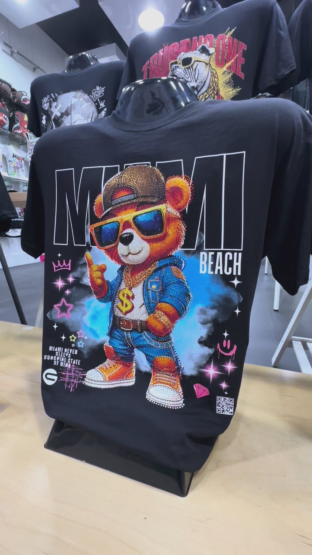 Shine with the Grooveman Miami Beach Teddy Bear Rhinestone Graphic T-Shirt 🌴✨. This exclusive design features our iconic teddy mascot in full bling bling rhinestones, giving it a bold sparkling effect that catches the light from every angle. Perfect for Miami lovers, streetwear fans, and anyone who wants to stand out in true 305 style.