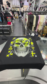 Skull graphic fully embellished with neon yellow rhinestones