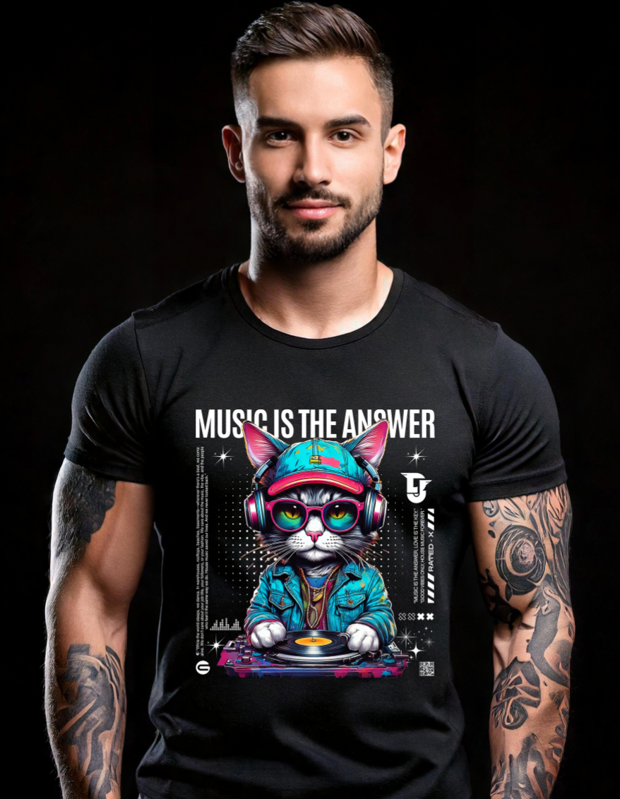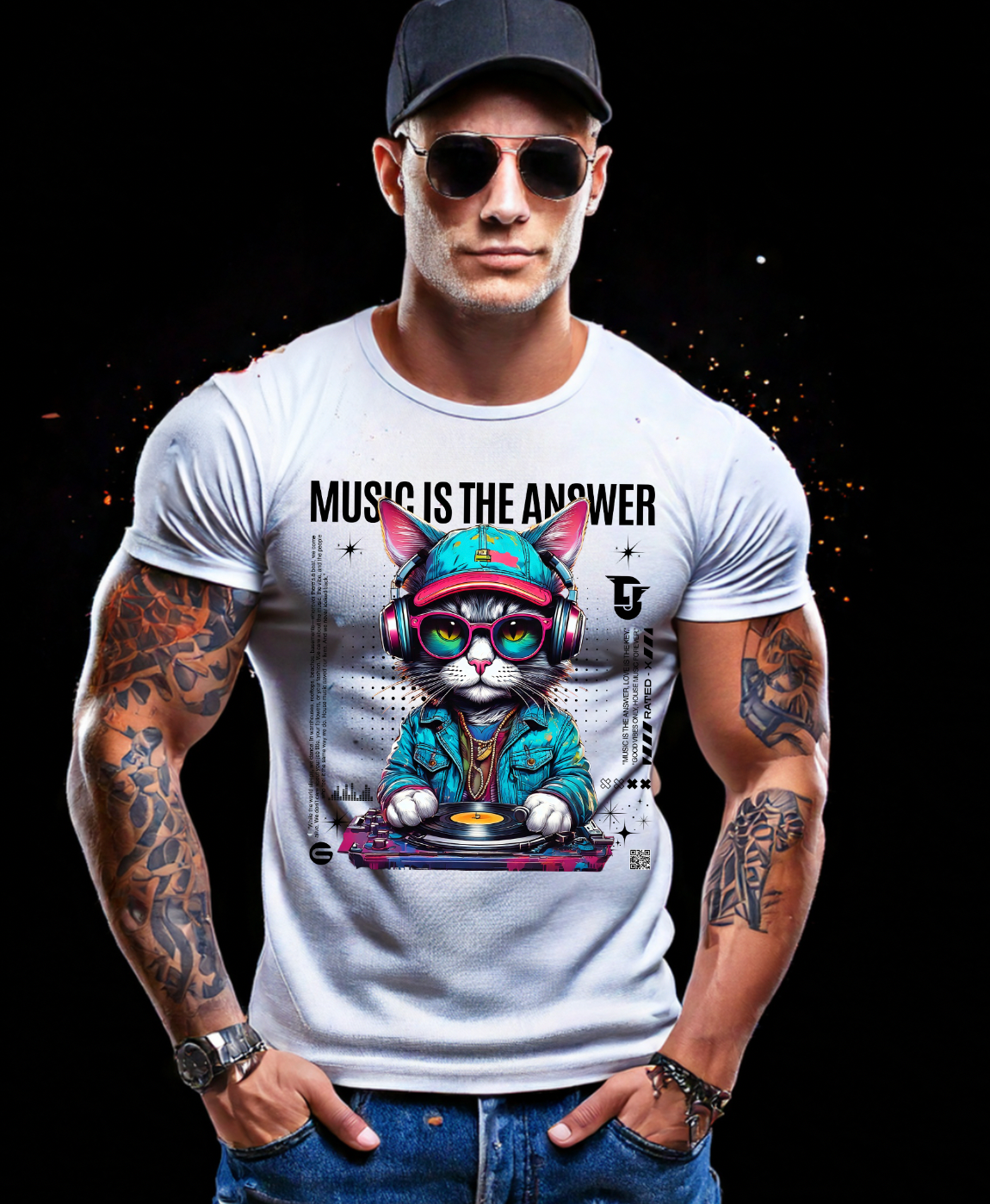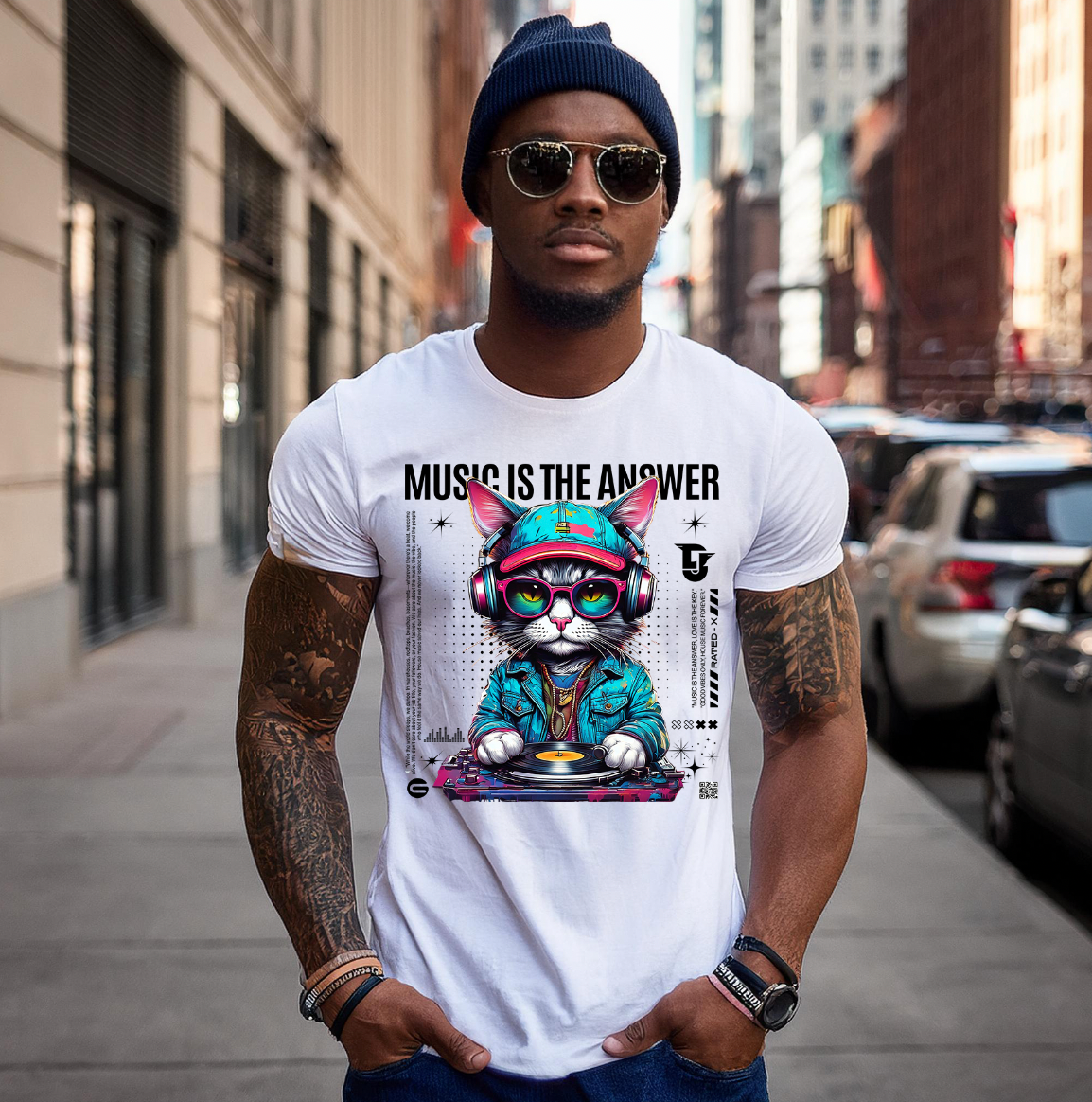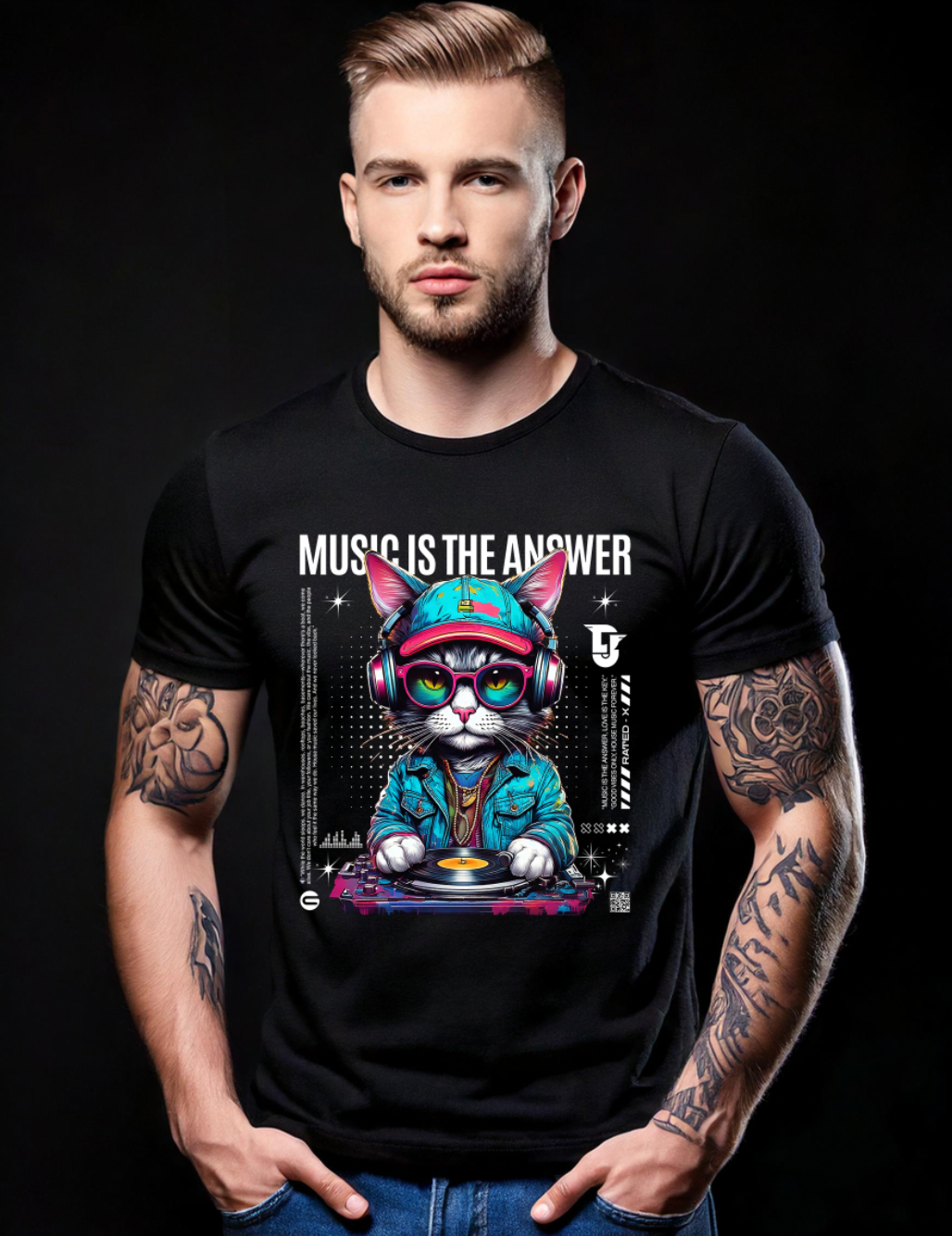 This exclusive shirt is for the true music lover who knows that "Cat Music is the Answer!" Featuring eye-catching artwork and the signature Grooveman TM logo, this T-shirt is perfect for any occasion. Show off your love for feline-inspired tunes with pride in this ultra-comfortable shirt.