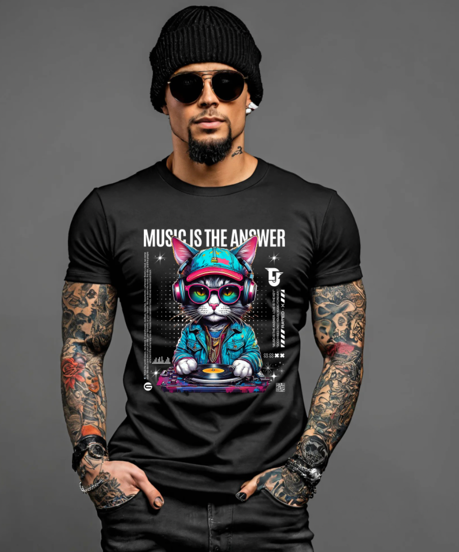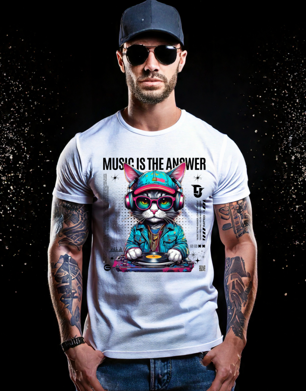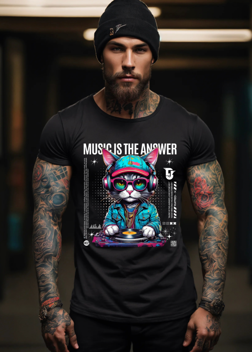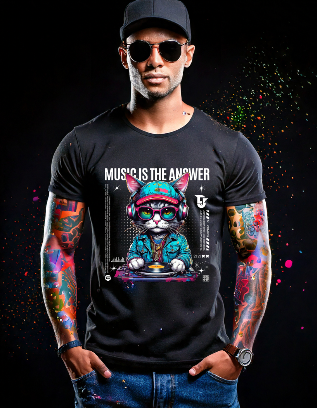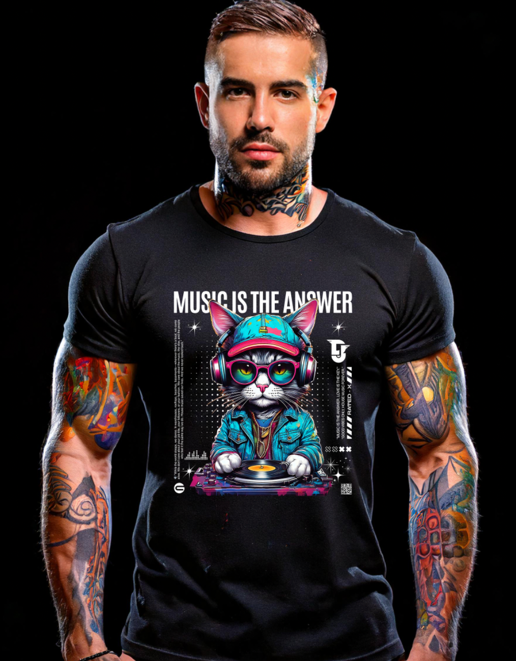 This exclusive shirt is for the true music lover who knows that "Cat Music is the Answer!" Featuring eye-catching artwork and the signature Grooveman TM logo, this T-shirt is perfect for any occasion. Show off your love for feline-inspired tunes with pride in this ultra-comfortable shirt.