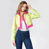 DENIM JACKET WITH COLOR BLOCK HOODIES - ZIPPER CLOSURE WIT HOODIES ATTACHED - DISTRESSED DENIM - CROPPED LENGTH SIZE S : LENGTH - 16 INCH, CHEST - 18.5 INCH *JUNIOR SIZING IN GENERAL IS MORE FITTING AND SITS TIGHTER AVAILABLE IN JUNIOR AND JUNIOR PLUS SIZING IMPORTED, DESIGNED IN USA
