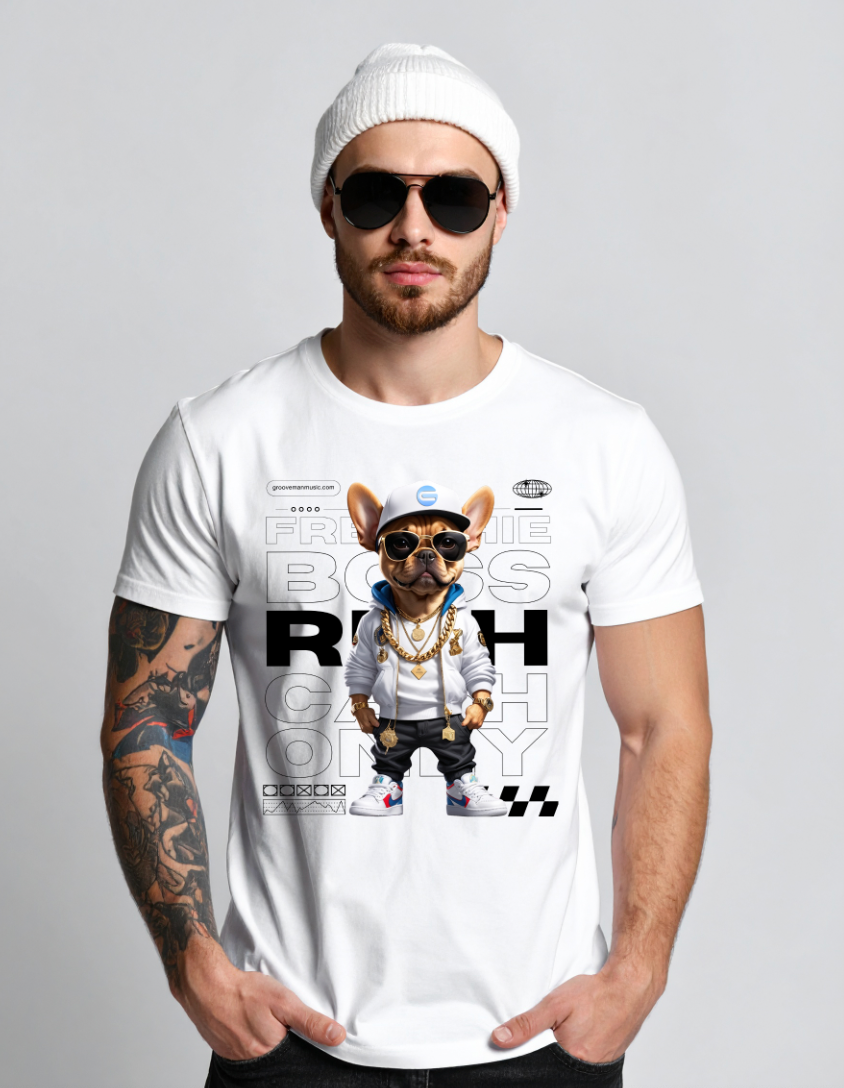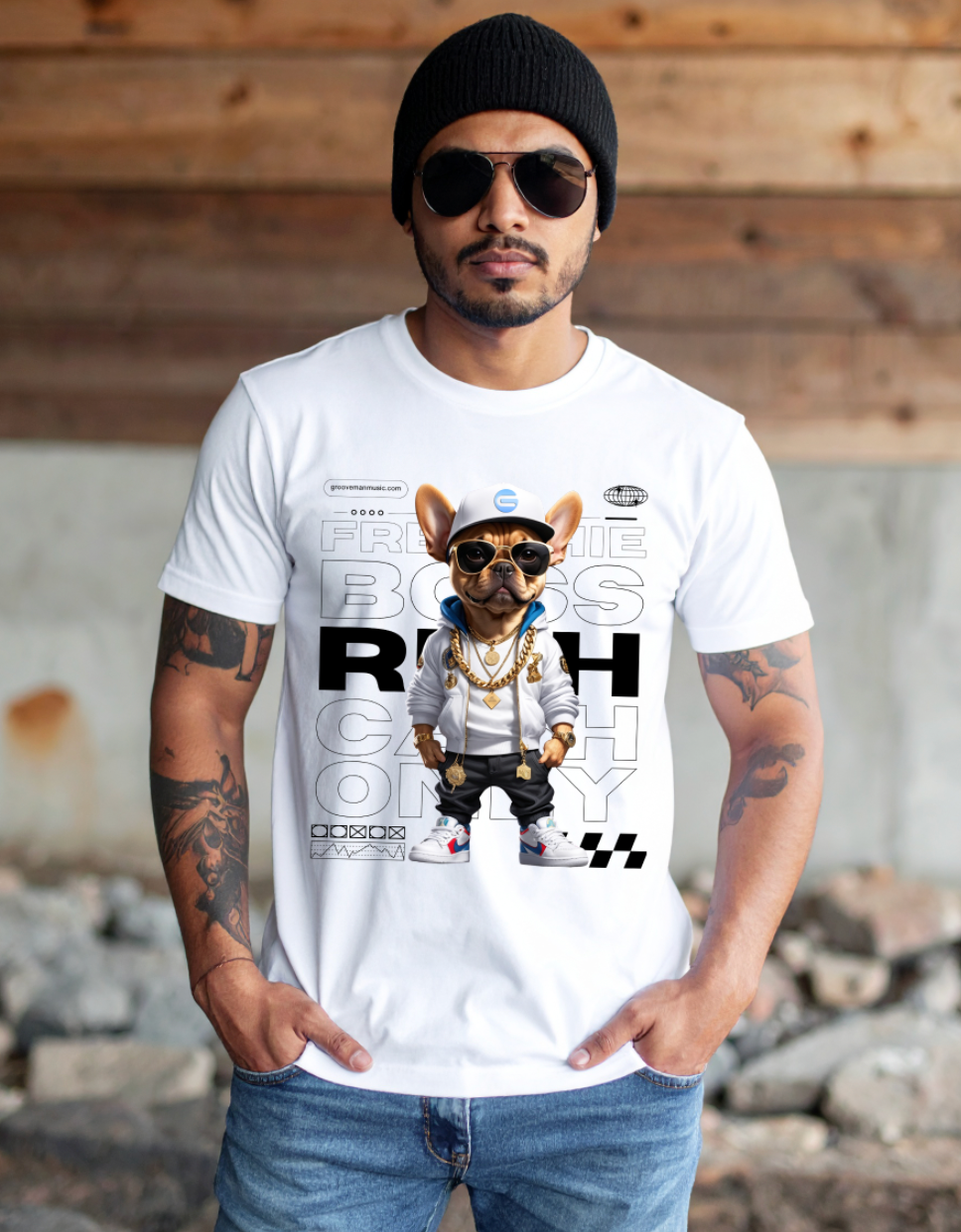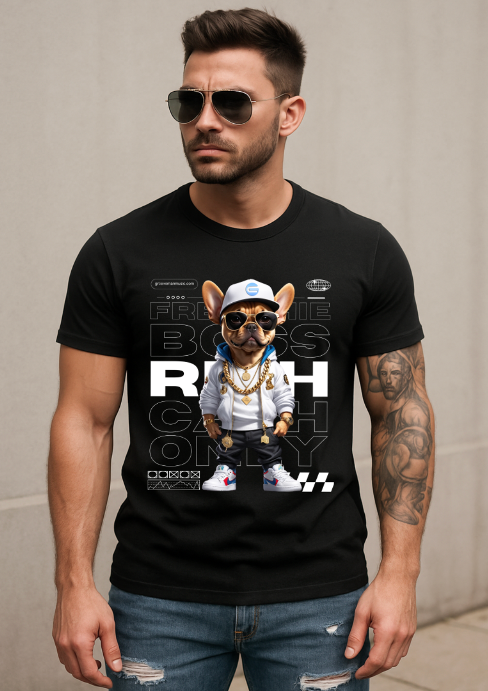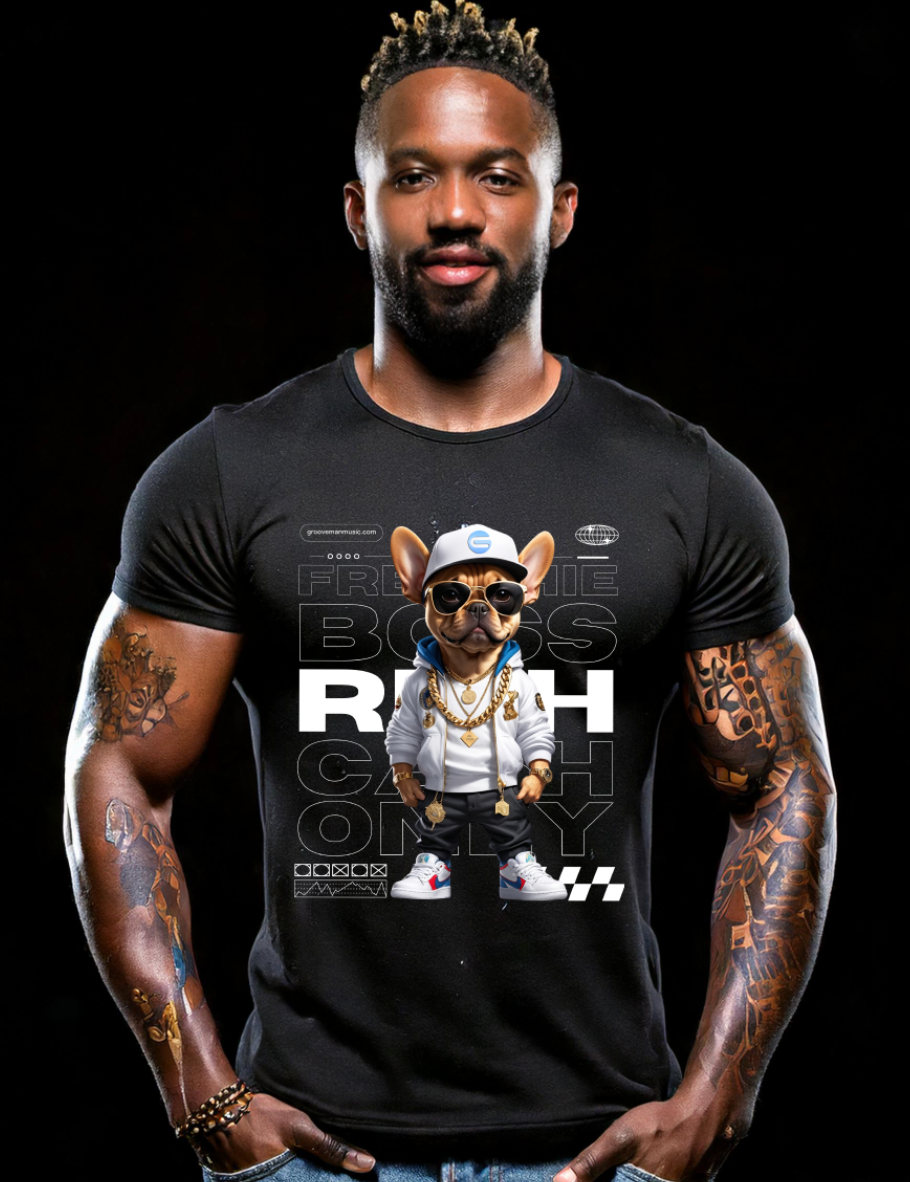 Introducing the Frenchie Flex Tee, where street hustle meets canine swagger. This Grooveman™ original features a bold French bulldog gripping stacks, rocking the rich life like a true boss 💼🐾