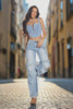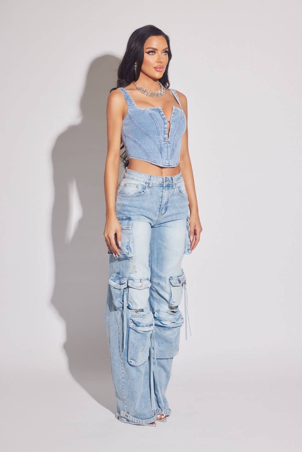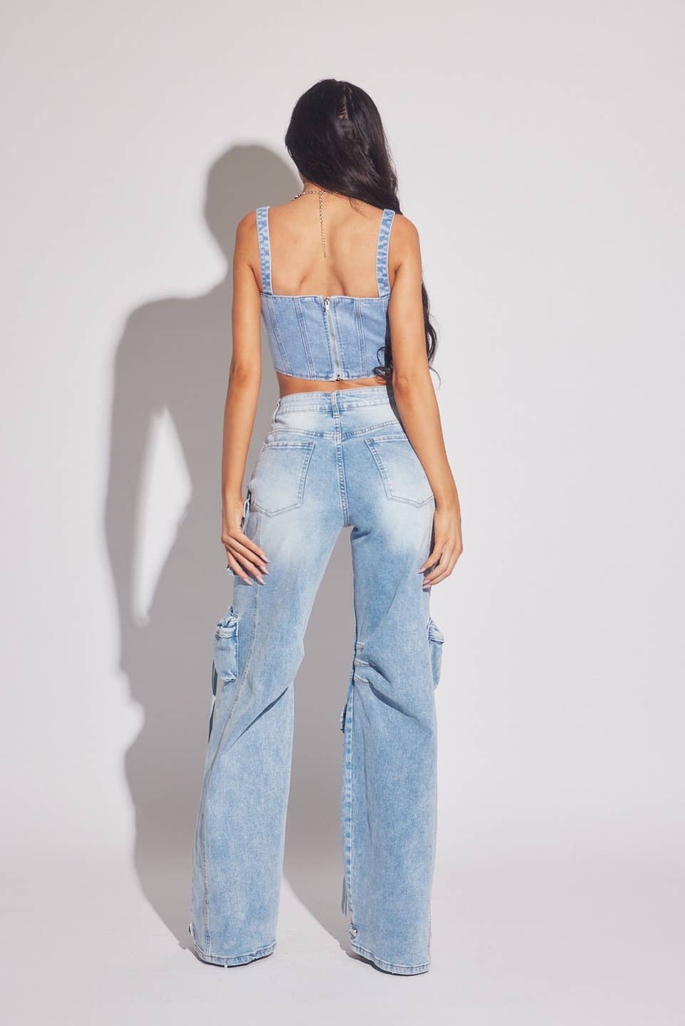 Our best seller cargo style in the best seller colorway light wash. Distressed details, trims and colorway are unique to our brand. High stretch of course, one of the best in quality. Customer reordered style every time. Model wears size Small in the cargo, available sizing now only Small Medium and Large. Model wears size Small.