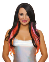 Long, straight layered Hair Extensions in Magenta/Neon Pink/Orange. The set comes with three 23” long clip-on pieces: one 9” center track and two 2” sidetracks.
